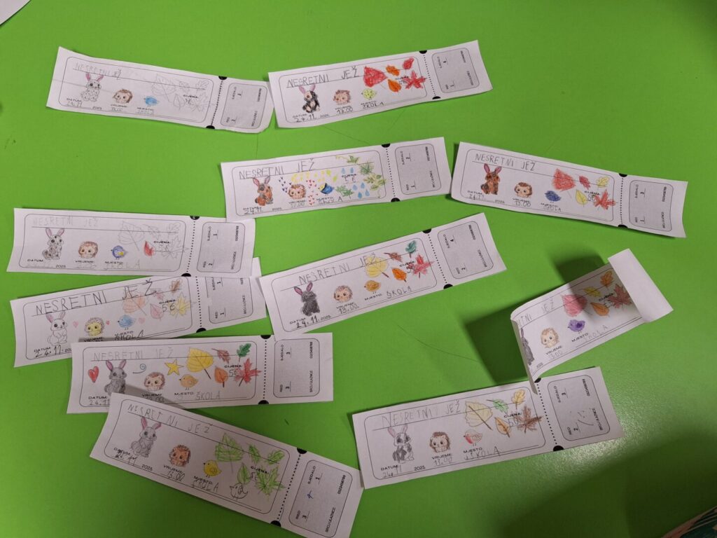 Nakon kazališnog bontona, učenici su se kreativno izražavali izrađujući ulaznice. Kupnjom ulaznica naučili su očitati u koji red i na koje sjedalo trebaju sjesti kako bi prisustvovali predstavi.