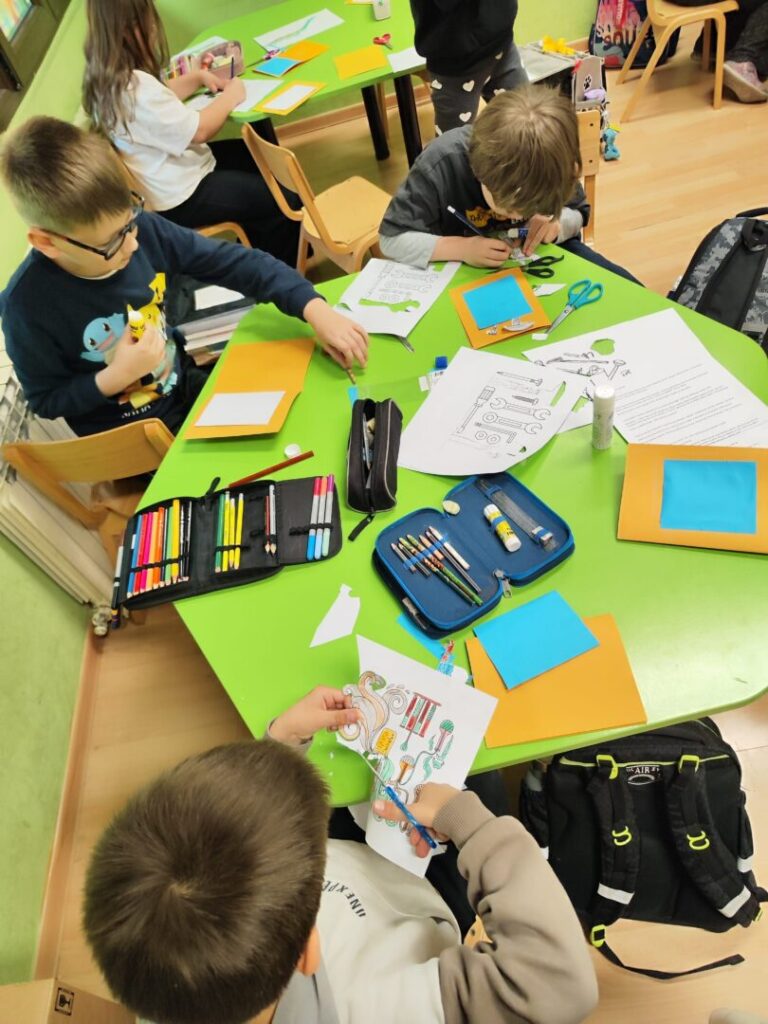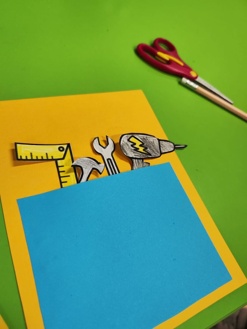 izrađivali tehnikom kolaža. Svaka čestitka sadrži džepić u koji su učenici smjestili crteže alata koje