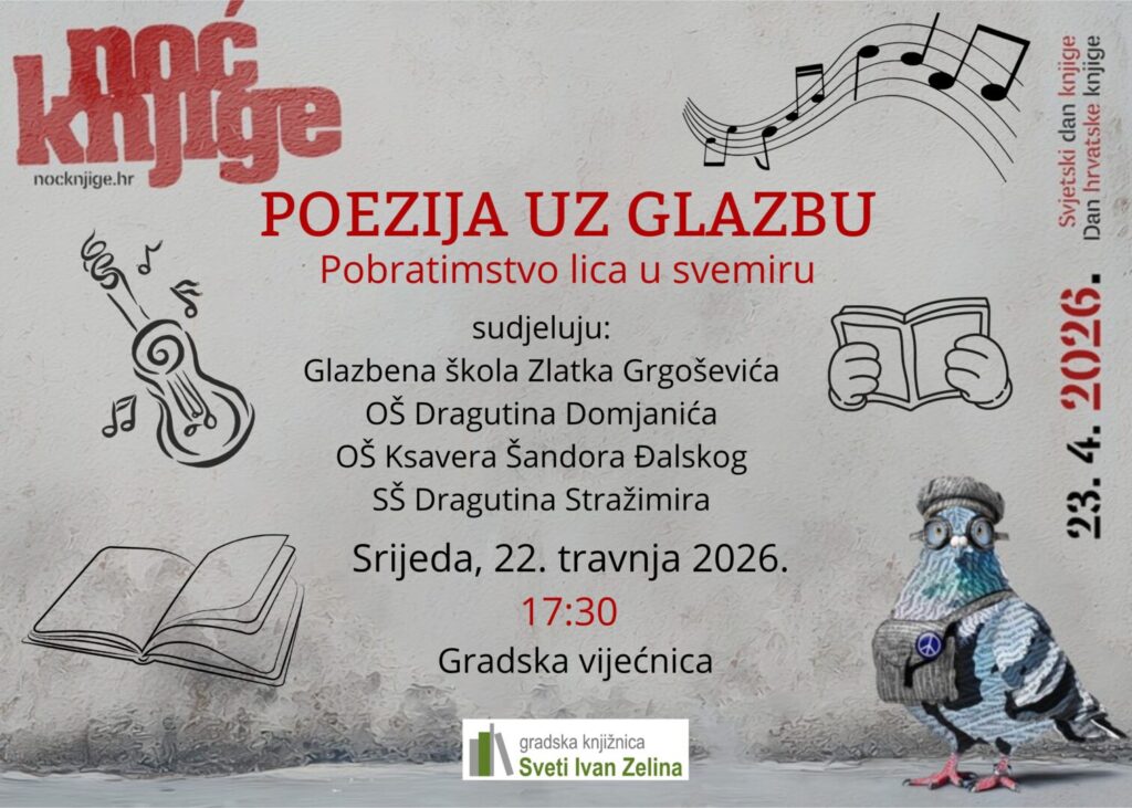 Povodom manifestacije Noć knjige, koja ove godine obilježava 15 godina kontinuiranog obilježavanja, učenici škola s područja našeg grada spojit će dvije umjetnosti: glazbu i pjesništvo. Program će izvesti kreativni mladi izvođači osnovnih, srednje i glazbene škole. Susret će se održati u srijedu, 22. travnja u 17:30 u Gradskoj vijećnici. Pozivamo da nam se pridruže svi ljubitelji lijepe riječi i klasične glazbe! Ulaz je slobodan.