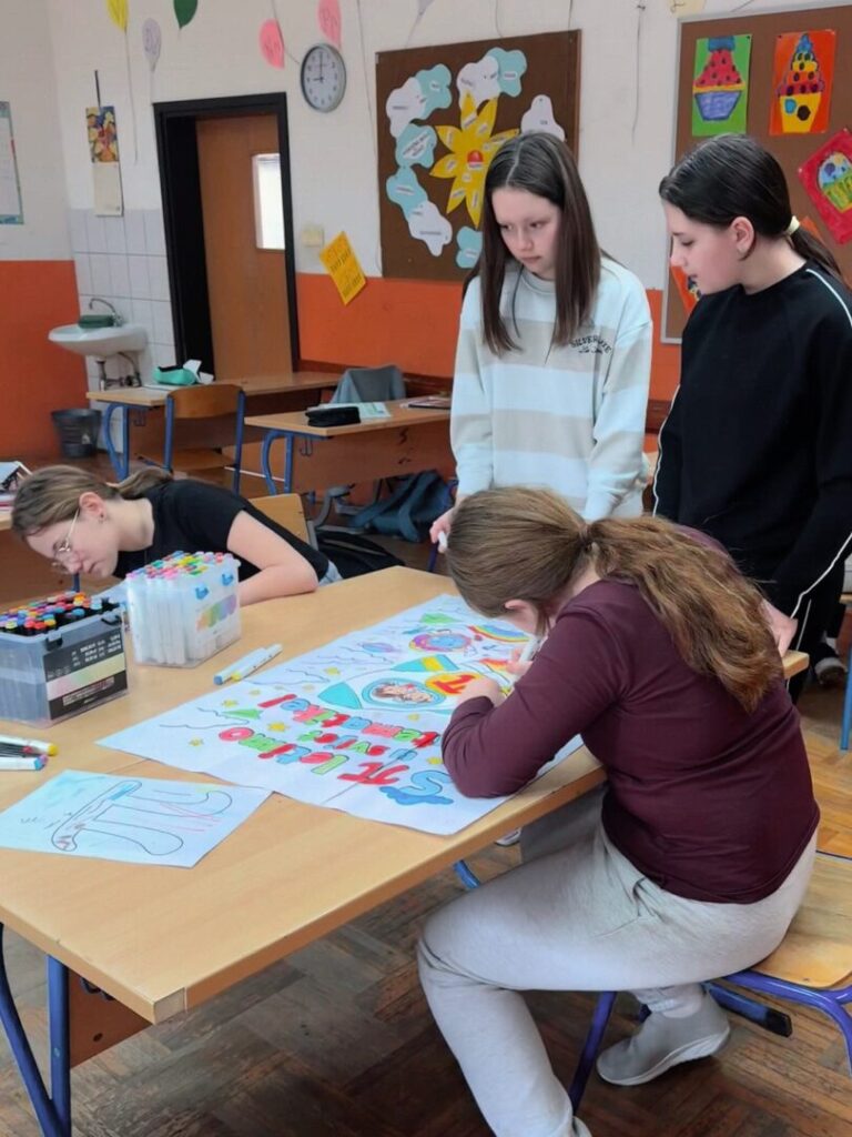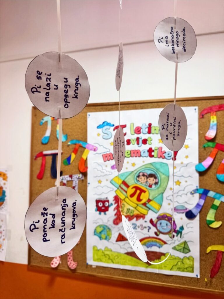 Obilježavanje ovoga dana u našoj školi proteklo je u ozračju suradnje, stvaralaštva i aktivnog učenja. Učenici su s velikim interesom i angažmanom izradili plakat pod nazivom „Sa Pi letimo u svijet matematike!“, kojim su na kreativan način predstavili važnost i zanimljivosti vezane uz broj Pi. Školski prostor dodatno su obogatili izradom skulpture u obliku broja Pi od balona, čime su pokazali maštovitost, preciznost i spremnost na timski rad.