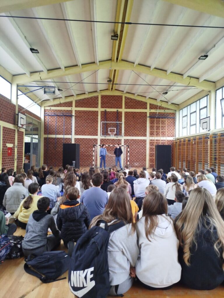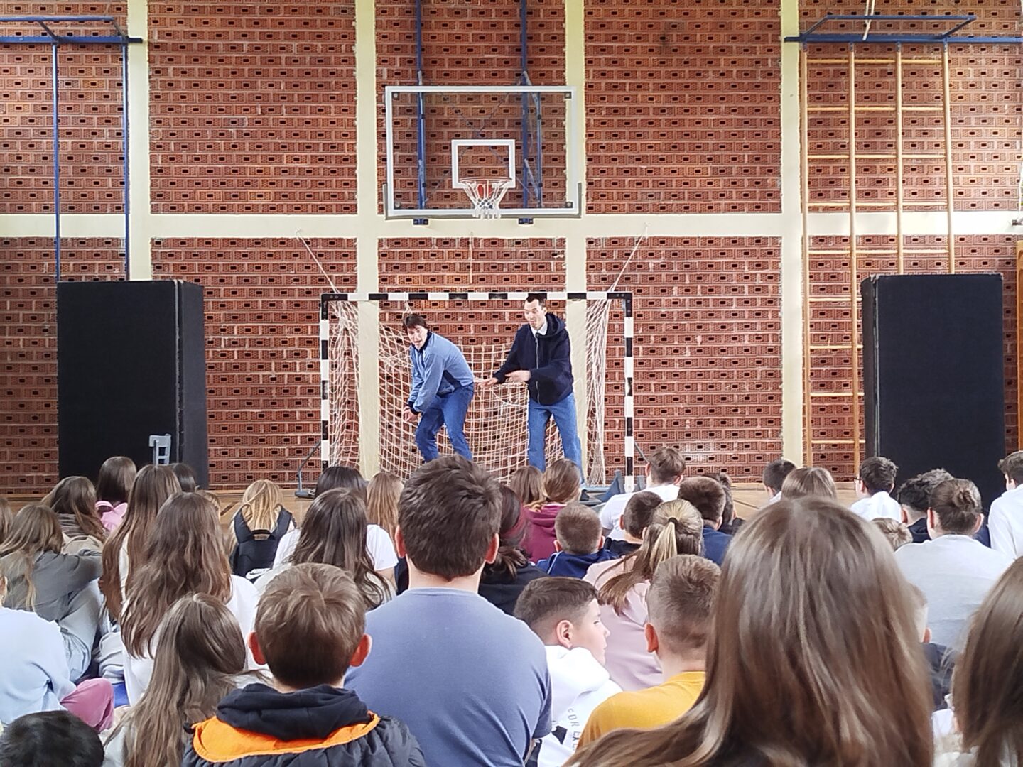 U srijedu, 29. travnja 2026., našu su školu posjetili glumci kazališta Mala scena te za učenike petih i šestih razreda izveli predstavu Kamenje. Predstava prikazuje dva maloljetnika, dječake od 13 i 15 godina. Zabavljajući se i bacajući kamenje s nadvožnjaka, slučajno usmrte čovjeka na autocesti. Poruka ove potresne predstave je da maloljetnici unatoč neiskustvu ipak moraju promišljati o svojim postupcima te posljedicama istih.