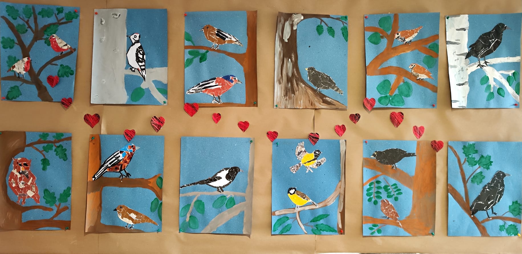 Povodom Valentinova učenici produženog boravka sudjelovali su u likovnoj aktivnosti tijekom koje su tehnikom tempere i kolaž papira izrađivali zaljubljene ptice. U radu su primijenili znanje o pticama zavičaja, ali usput i saznali neke zanimljivosti o njima. Izrezivali su i lijepili različite vrste ptica na podlogu oslikanu temperama. Zaljubljene ptice izložili su na školskom panou.